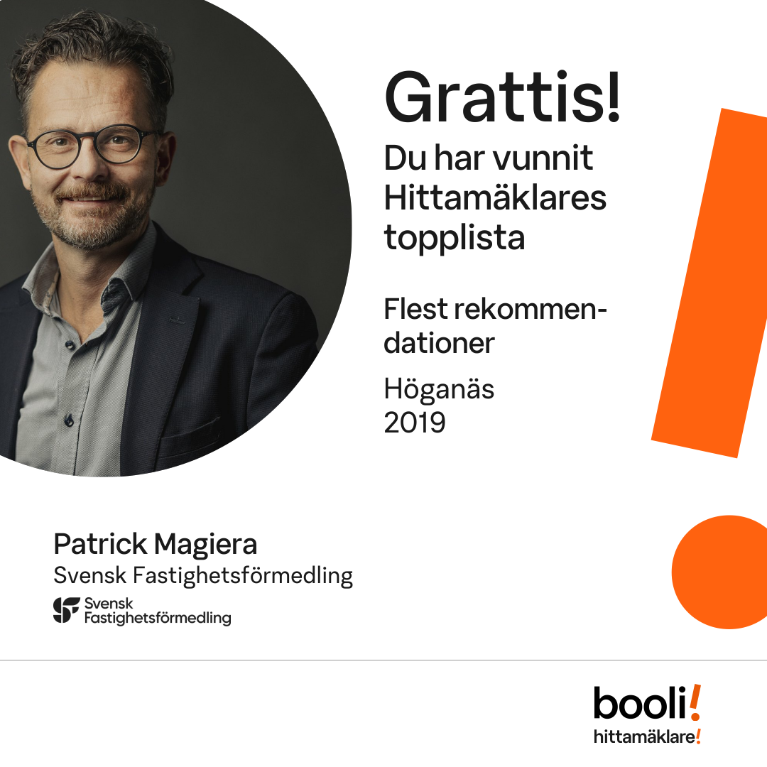 Statistik för publicerade bostäder, försäljningar och omdömen baseras på data från Booli och Hittamäklare. Statistiken för försäljningar avser inrapporterade och verifierade slutpriser från mäklare eller av Booli inhämtade och verifierade slutpriser. Statistiken för publicerade bostäder baseras på information som publicerats på Booli.se. Statistik för omdömen och rekommendationer baseras på omdömen från säljare som lämnats via Booli och Hittamäklare.