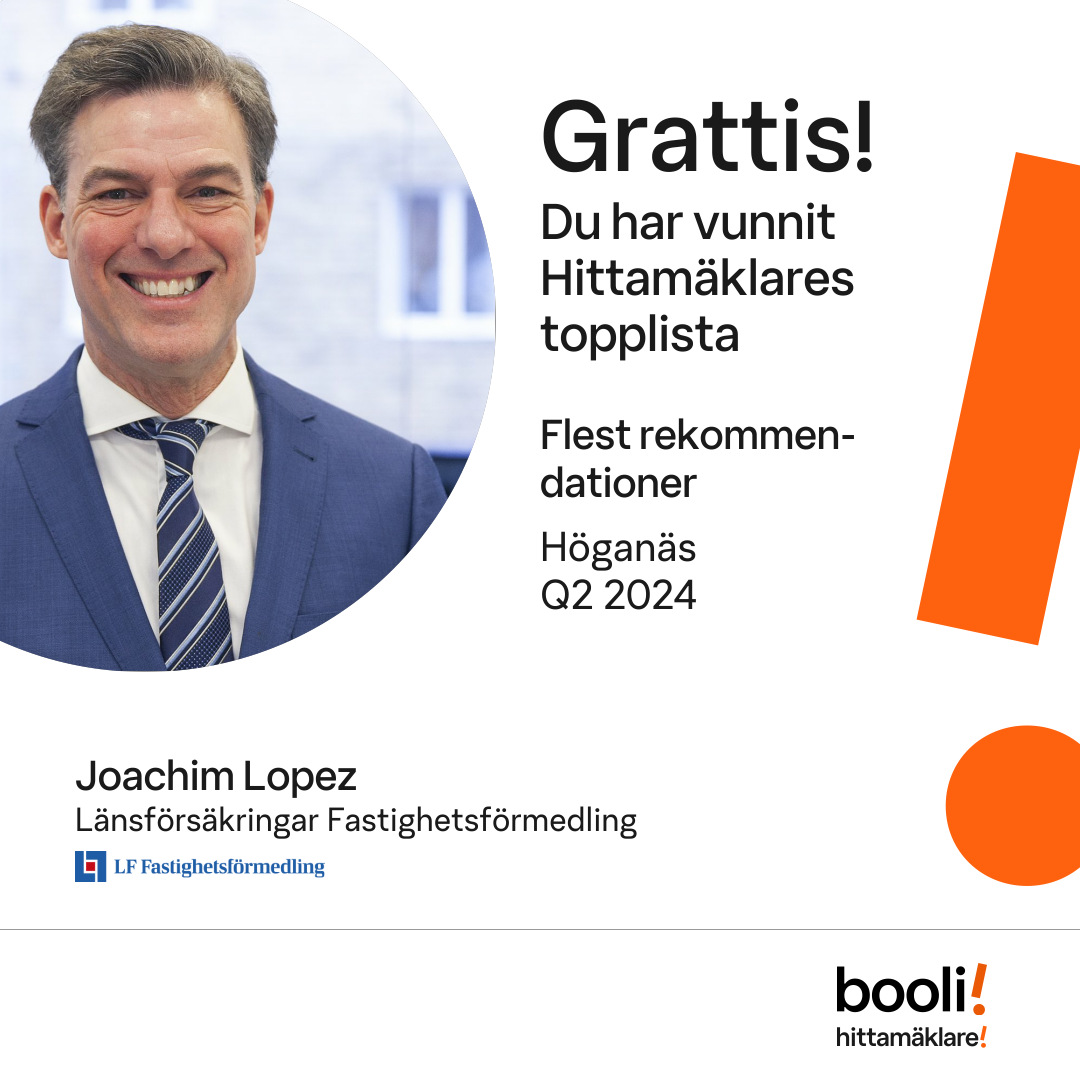 Statistik för publicerade bostäder, försäljningar och omdömen baseras på data från Booli och Hittamäklare. Statistiken för försäljningar avser inrapporterade och verifierade slutpriser från mäklare eller av Booli inhämtade och verifierade slutpriser. Statistiken för publicerade bostäder baseras på information som publicerats på Booli.se. Statistik för omdömen och rekommendationer baseras på omdömen från säljare som lämnats via Booli och Hittamäklare.