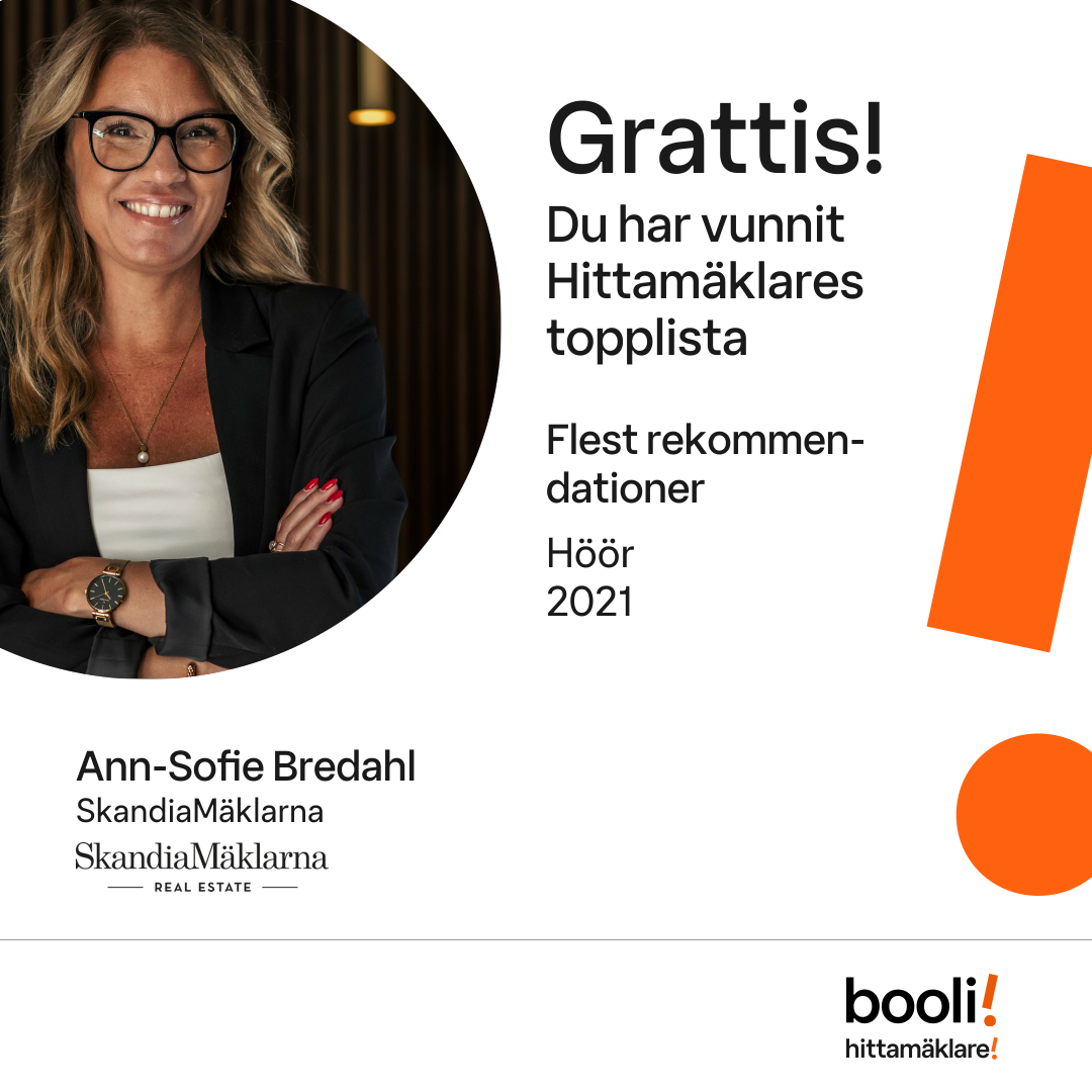 Statistik för publicerade bostäder, försäljningar och omdömen baseras på data från Booli och Hittamäklare. Statistiken för försäljningar avser inrapporterade och verifierade slutpriser från mäklare eller av Booli inhämtade och verifierade slutpriser. Statistiken för publicerade bostäder baseras på information som publicerats på Booli.se. Statistik för omdömen och rekommendationer baseras på omdömen från säljare som lämnats via Booli och Hittamäklare.