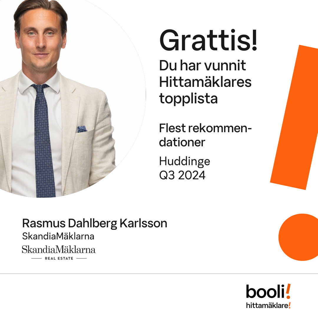 Statistik för publicerade bostäder, försäljningar och omdömen baseras på data från Booli. Statistiken för försäljningar avser inrapporterade och verifierade slutpriser från mäklare eller av Booli inhämtade och verifierade slutpriser. Statistiken för publicerade bostäder baseras på information som publicerats på Booli.se. Statistik för omdömen och rekommendationer baseras på omdömen från säljare som lämnats via Booli.