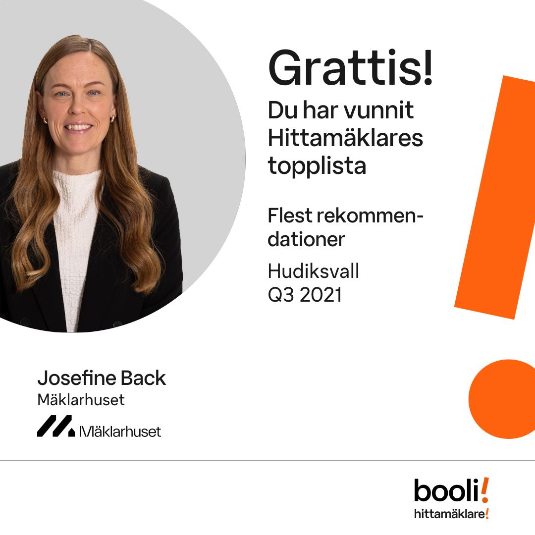 Statistik för publicerade bostäder, försäljningar och omdömen baseras på data från Booli och Hittamäklare. Statistiken för försäljningar avser inrapporterade och verifierade slutpriser från mäklare eller av Booli inhämtade och verifierade slutpriser. Statistiken för publicerade bostäder baseras på information som publicerats på Booli.se. Statistik för omdömen och rekommendationer baseras på omdömen från säljare som lämnats via Booli och Hittamäklare.