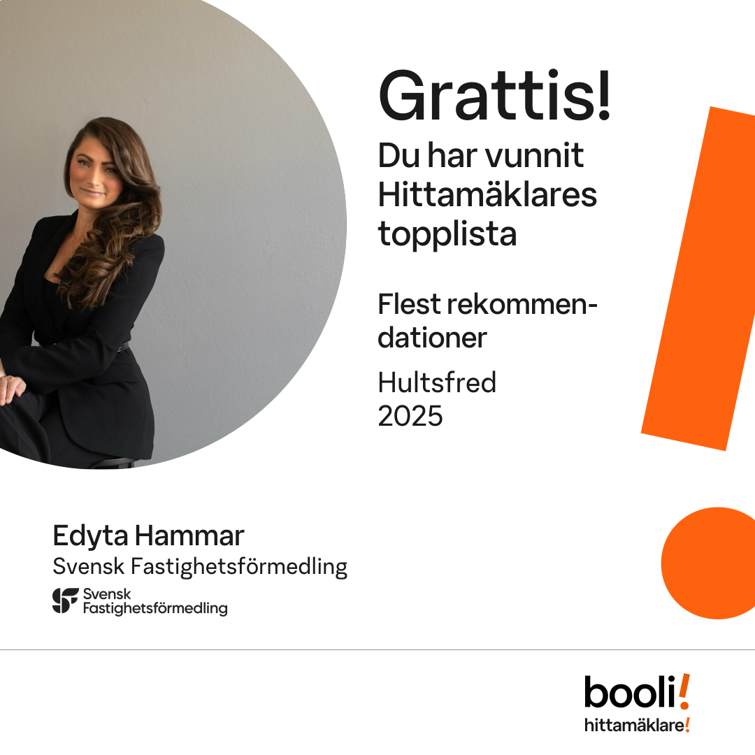 Statistik för publicerade bostäder, försäljningar och omdömen baseras på data från Booli och Hittamäklare. Statistiken för försäljningar avser inrapporterade och verifierade slutpriser från mäklare eller av Booli inhämtade och verifierade slutpriser. Statistiken för publicerade bostäder baseras på information som publicerats på Booli.se. Statistik för omdömen och rekommendationer baseras på omdömen från säljare som lämnats via Booli och Hittamäklare.