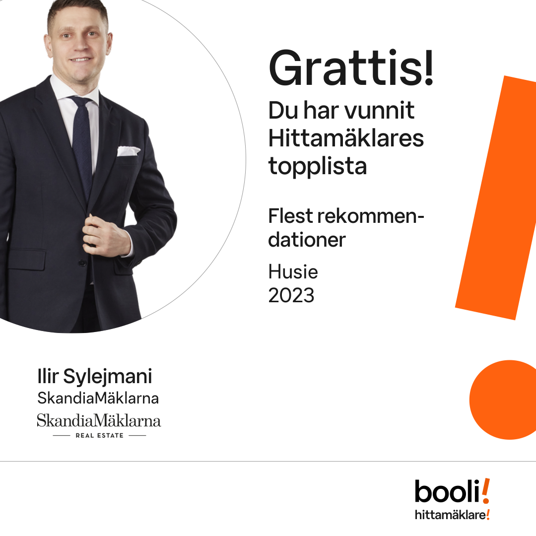 Statistik för publicerade bostäder, försäljningar och omdömen baseras på data från Booli och Hittamäklare. Statistiken för försäljningar avser inrapporterade och verifierade slutpriser från mäklare eller av Booli inhämtade och verifierade slutpriser. Statistiken för publicerade bostäder baseras på information som publicerats på Booli.se. Statistik för omdömen och rekommendationer baseras på omdömen från säljare som lämnats via Booli och Hittamäklare.