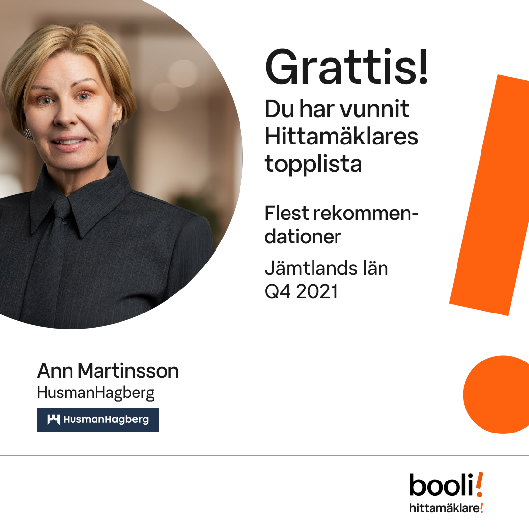 Statistik för publicerade bostäder, försäljningar och omdömen baseras på data från Booli och Hittamäklare. Statistiken för försäljningar avser inrapporterade och verifierade slutpriser från mäklare eller av Booli inhämtade och verifierade slutpriser. Statistiken för publicerade bostäder baseras på information som publicerats på Booli.se. Statistik för omdömen och rekommendationer baseras på omdömen från säljare som lämnats via Booli och Hittamäklare.