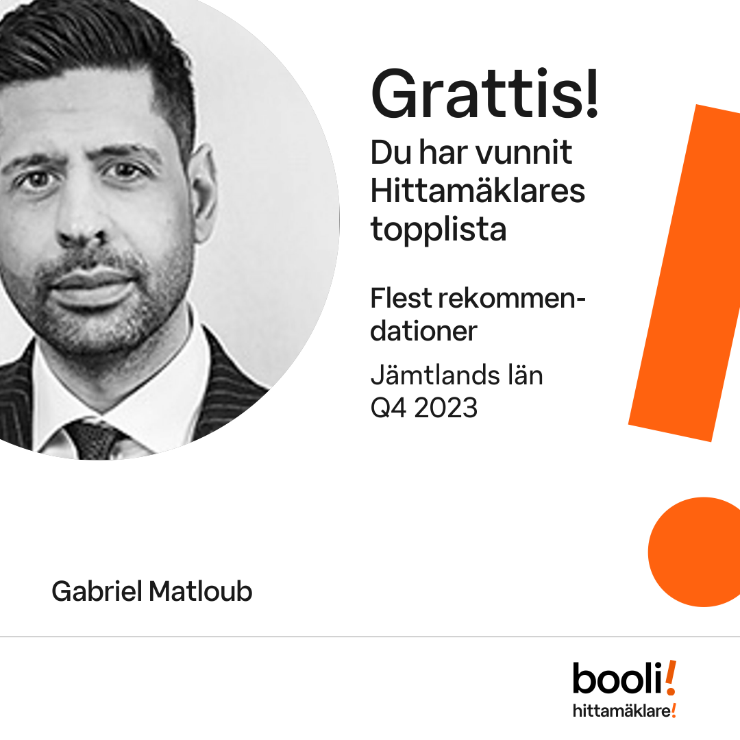Statistik för publicerade bostäder, försäljningar och omdömen baseras på data från Booli och Hittamäklare. Statistiken för försäljningar avser inrapporterade och verifierade slutpriser från mäklare eller av Booli inhämtade och verifierade slutpriser. Statistiken för publicerade bostäder baseras på information som publicerats på Booli.se. Statistik för omdömen och rekommendationer baseras på omdömen från säljare som lämnats via Booli och Hittamäklare.