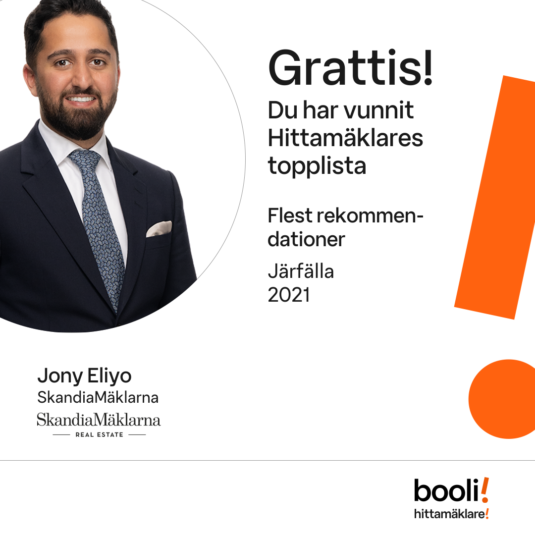 Statistik för publicerade bostäder, försäljningar och omdömen baseras på data från Booli och Hittamäklare. Statistiken för försäljningar avser inrapporterade och verifierade slutpriser från mäklare eller av Booli inhämtade och verifierade slutpriser. Statistiken för publicerade bostäder baseras på information som publicerats på Booli.se. Statistik för omdömen och rekommendationer baseras på omdömen från säljare som lämnats via Booli och Hittamäklare.
