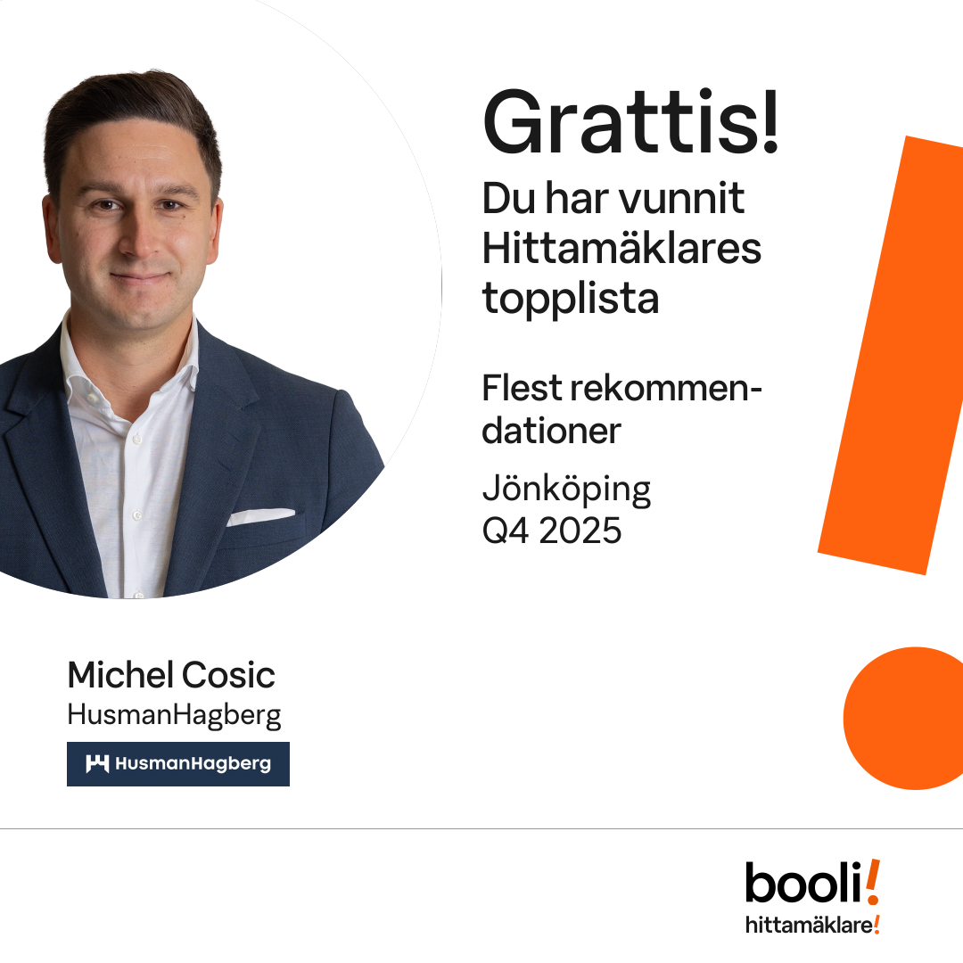 Statistik för publicerade bostäder, försäljningar och omdömen baseras på data från Booli och Hittamäklare. Statistiken för försäljningar avser inrapporterade och verifierade slutpriser från mäklare eller av Booli inhämtade och verifierade slutpriser. Statistiken för publicerade bostäder baseras på information som publicerats på Booli.se. Statistik för omdömen och rekommendationer baseras på omdömen från säljare som lämnats via Booli och Hittamäklare.