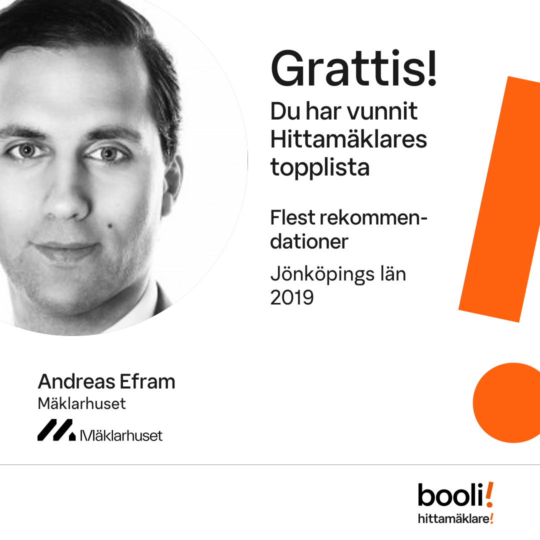 Statistik för publicerade bostäder, försäljningar och omdömen baseras på data från Booli och Hittamäklare. Statistiken för försäljningar avser inrapporterade och verifierade slutpriser från mäklare eller av Booli inhämtade och verifierade slutpriser. Statistiken för publicerade bostäder baseras på information som publicerats på Booli.se. Statistik för omdömen och rekommendationer baseras på omdömen från säljare som lämnats via Booli och Hittamäklare.