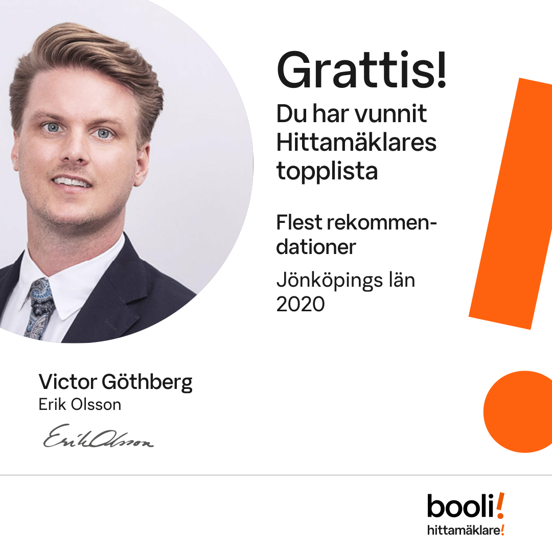 Statistik för publicerade bostäder, försäljningar och omdömen baseras på data från Booli och Hittamäklare. Statistiken för försäljningar avser inrapporterade och verifierade slutpriser från mäklare eller av Booli inhämtade och verifierade slutpriser. Statistiken för publicerade bostäder baseras på information som publicerats på Booli.se. Statistik för omdömen och rekommendationer baseras på omdömen från säljare som lämnats via Booli och Hittamäklare.