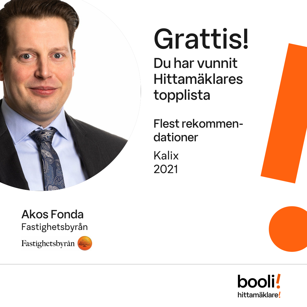 Statistik för publicerade bostäder, försäljningar och omdömen baseras på data från Booli och Hittamäklare. Statistiken för försäljningar avser inrapporterade och verifierade slutpriser från mäklare eller av Booli inhämtade och verifierade slutpriser. Statistiken för publicerade bostäder baseras på information som publicerats på Booli.se. Statistik för omdömen och rekommendationer baseras på omdömen från säljare som lämnats via Booli och Hittamäklare.