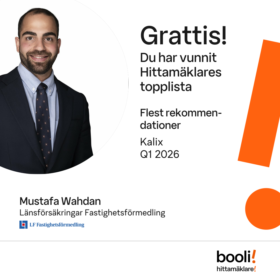 Statistik för publicerade bostäder, försäljningar och omdömen baseras på data från Booli. Statistiken för försäljningar avser inrapporterade och verifierade slutpriser från mäklare eller av Booli inhämtade och verifierade slutpriser. Statistiken för publicerade bostäder baseras på information som publicerats på Booli.se. Statistik för omdömen och rekommendationer baseras på omdömen från säljare som lämnats via Booli.