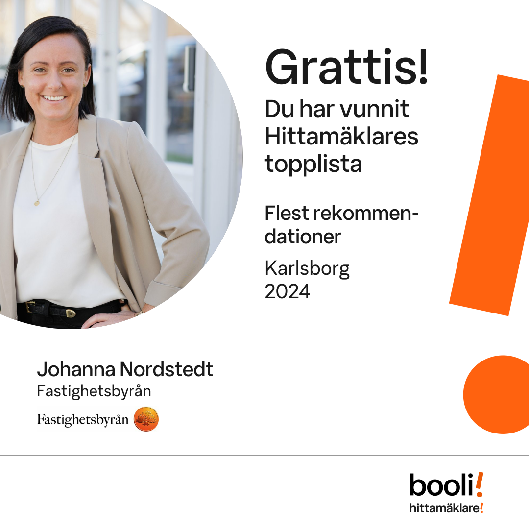 Statistik för publicerade bostäder, försäljningar och omdömen baseras på data från Booli och Hittamäklare. Statistiken för försäljningar avser inrapporterade och verifierade slutpriser från mäklare eller av Booli inhämtade och verifierade slutpriser. Statistiken för publicerade bostäder baseras på information som publicerats på Booli.se. Statistik för omdömen och rekommendationer baseras på omdömen från säljare som lämnats via Booli och Hittamäklare.