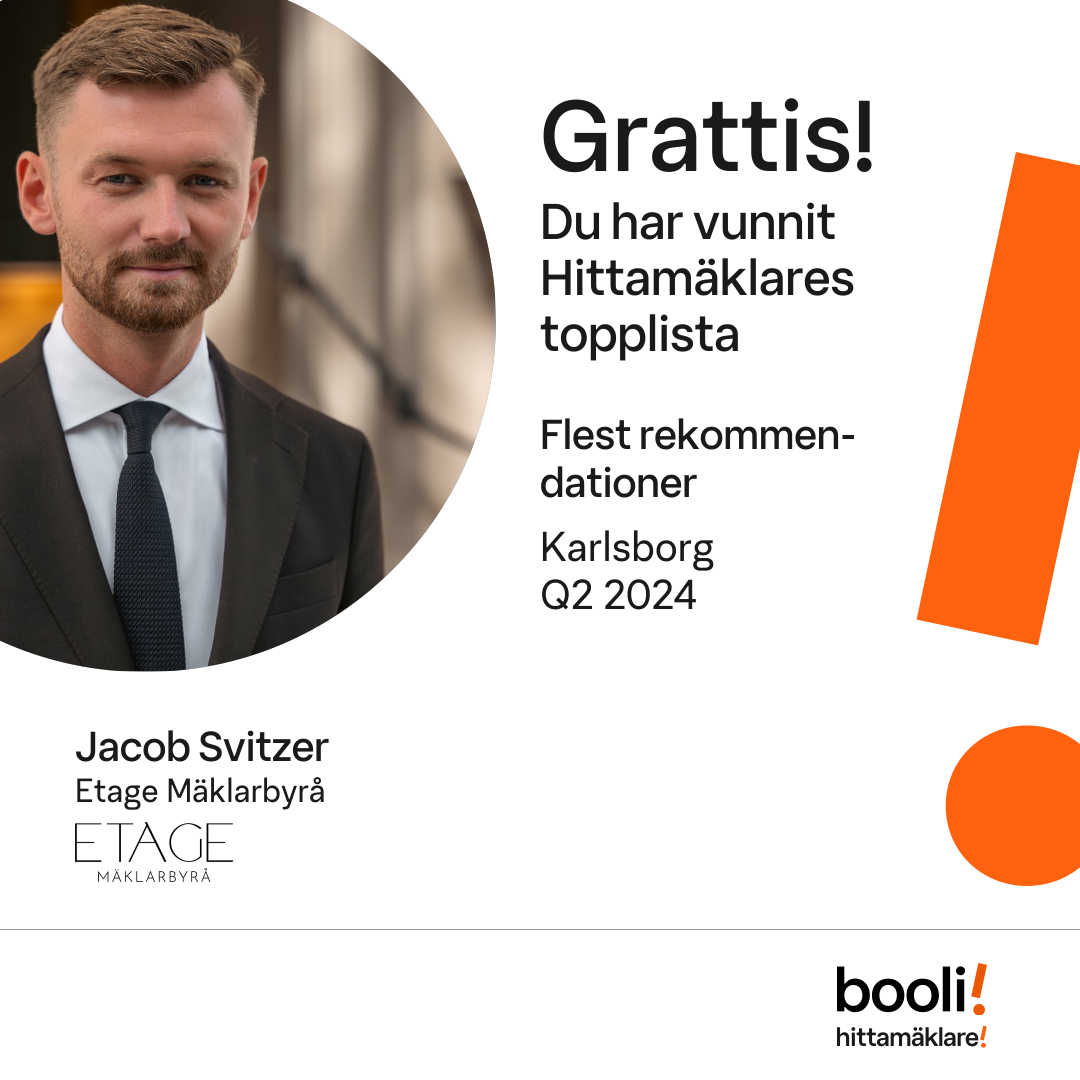 Statistik för publicerade bostäder, försäljningar och omdömen baseras på data från Booli och Hittamäklare. Statistiken för försäljningar avser inrapporterade och verifierade slutpriser från mäklare eller av Booli inhämtade och verifierade slutpriser. Statistiken för publicerade bostäder baseras på information som publicerats på Booli.se. Statistik för omdömen och rekommendationer baseras på omdömen från säljare som lämnats via Booli och Hittamäklare.