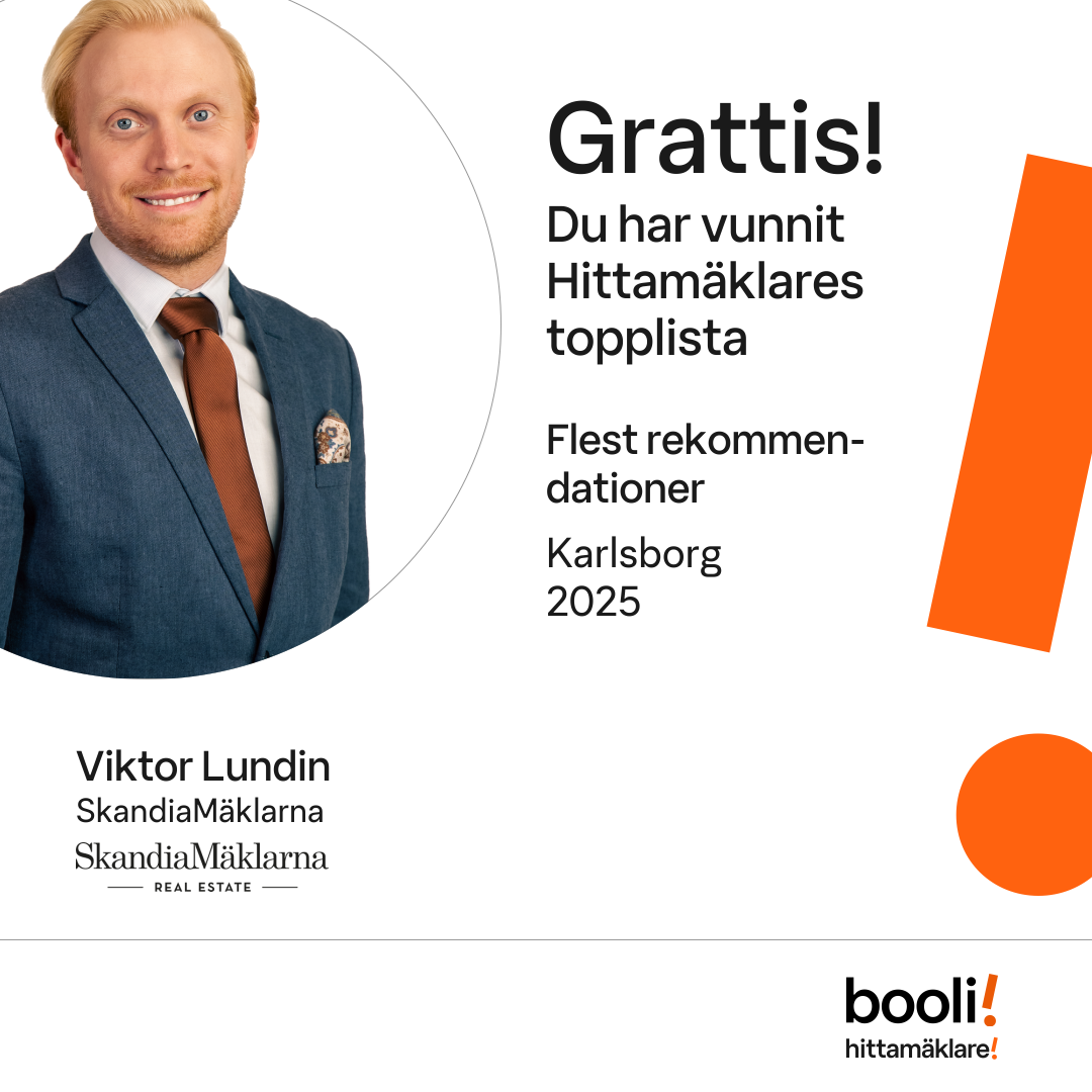 Statistik för publicerade bostäder, försäljningar och omdömen baseras på data från Booli och Hittamäklare. Statistiken för försäljningar avser inrapporterade och verifierade slutpriser från mäklare eller av Booli inhämtade och verifierade slutpriser. Statistiken för publicerade bostäder baseras på information som publicerats på Booli.se. Statistik för omdömen och rekommendationer baseras på omdömen från säljare som lämnats via Booli och Hittamäklare.