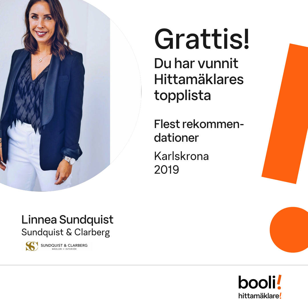 Statistik för publicerade bostäder, försäljningar och omdömen baseras på data från Booli och Hittamäklare. Statistiken för försäljningar avser inrapporterade och verifierade slutpriser från mäklare eller av Booli inhämtade och verifierade slutpriser. Statistiken för publicerade bostäder baseras på information som publicerats på Booli.se. Statistik för omdömen och rekommendationer baseras på omdömen från säljare som lämnats via Booli och Hittamäklare.
