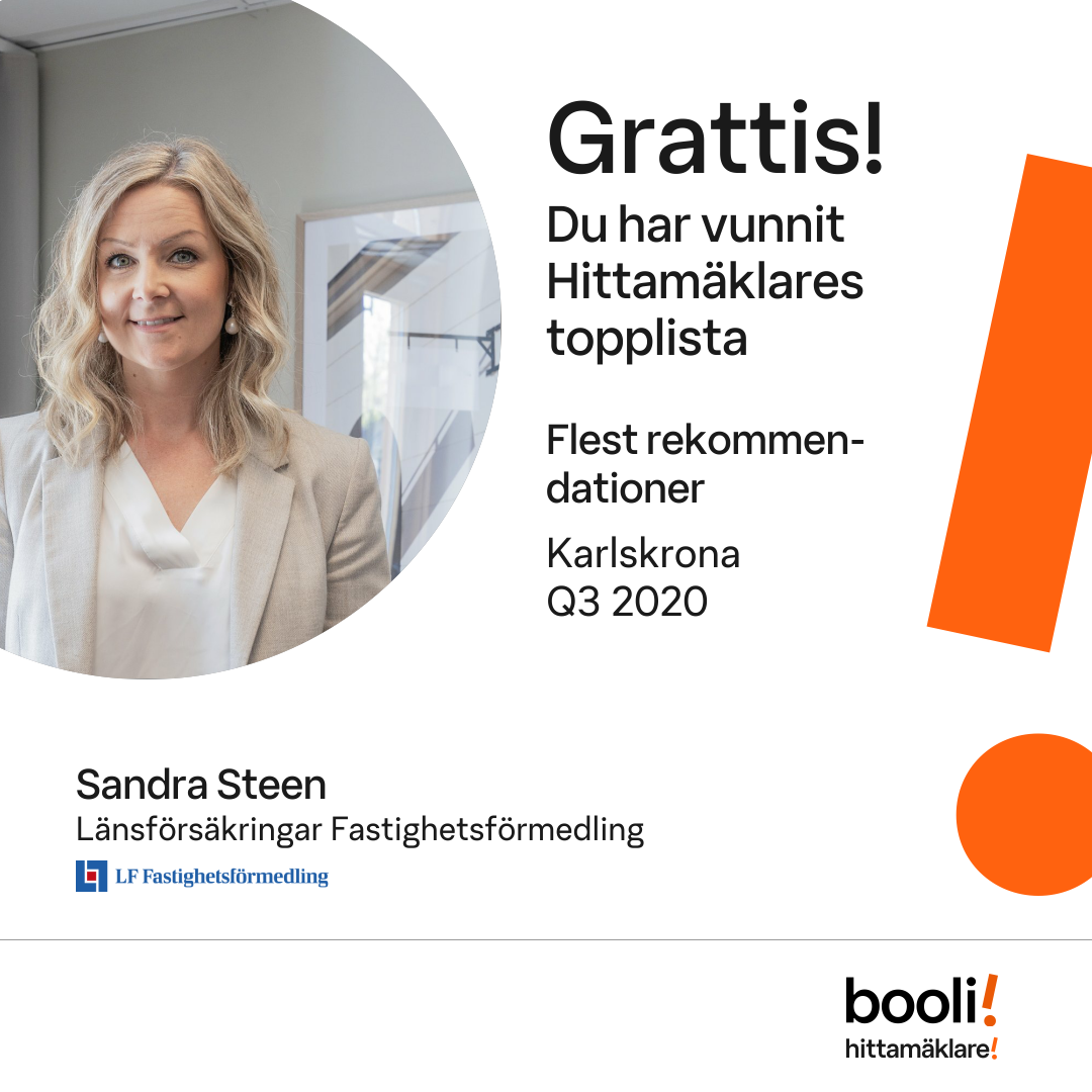 Statistik för publicerade bostäder, försäljningar och omdömen baseras på data från Booli och Hittamäklare. Statistiken för försäljningar avser inrapporterade och verifierade slutpriser från mäklare eller av Booli inhämtade och verifierade slutpriser. Statistiken för publicerade bostäder baseras på information som publicerats på Booli.se. Statistik för omdömen och rekommendationer baseras på omdömen från säljare som lämnats via Booli och Hittamäklare.