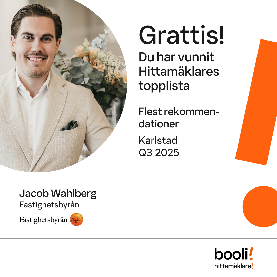 Statistik för publicerade bostäder, försäljningar och omdömen baseras på data från Booli och Hittamäklare. Statistiken för försäljningar avser inrapporterade och verifierade slutpriser från mäklare eller av Booli inhämtade och verifierade slutpriser. Statistiken för publicerade bostäder baseras på information som publicerats på Booli.se. Statistik för omdömen och rekommendationer baseras på omdömen från säljare som lämnats via Booli och Hittamäklare.