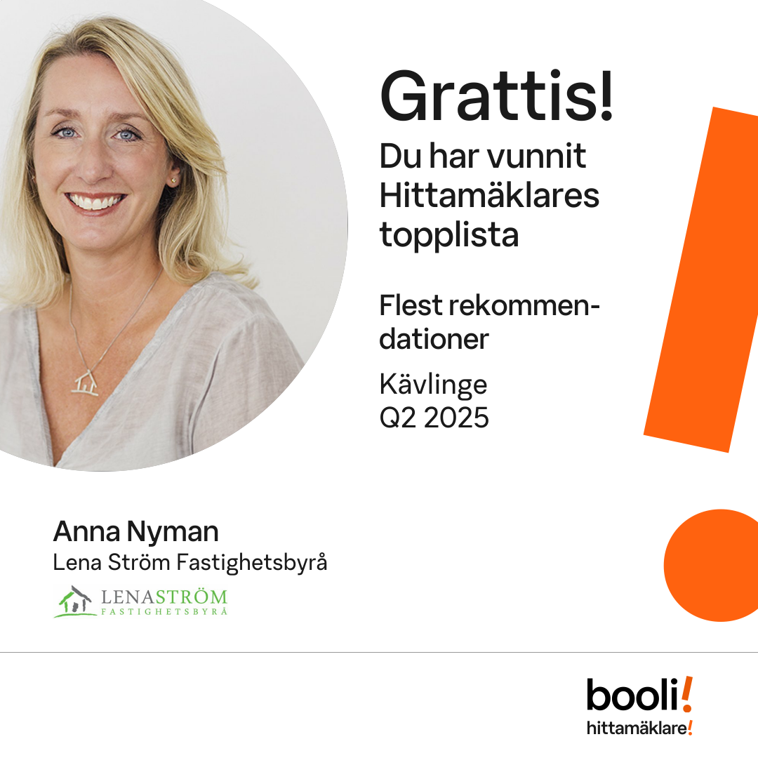 Statistik för publicerade bostäder, försäljningar och omdömen baseras på data från Booli och Hittamäklare. Statistiken för försäljningar avser inrapporterade och verifierade slutpriser från mäklare eller av Booli inhämtade och verifierade slutpriser. Statistiken för publicerade bostäder baseras på information som publicerats på Booli.se. Statistik för omdömen och rekommendationer baseras på omdömen från säljare som lämnats via Booli och Hittamäklare.