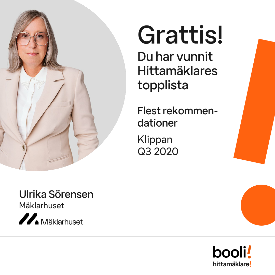 Statistik för publicerade bostäder, försäljningar och omdömen baseras på data från Booli och Hittamäklare. Statistiken för försäljningar avser inrapporterade och verifierade slutpriser från mäklare eller av Booli inhämtade och verifierade slutpriser. Statistiken för publicerade bostäder baseras på information som publicerats på Booli.se. Statistik för omdömen och rekommendationer baseras på omdömen från säljare som lämnats via Booli och Hittamäklare.