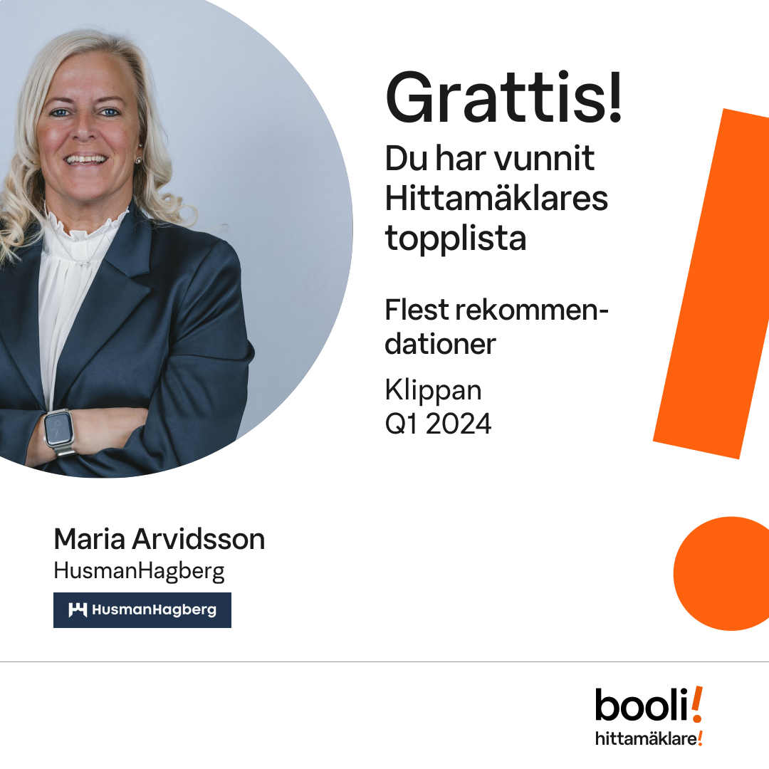 Statistik för publicerade bostäder, försäljningar och omdömen baseras på data från Booli. Statistiken för försäljningar avser inrapporterade och verifierade slutpriser från mäklare eller av Booli inhämtade och verifierade slutpriser. Statistiken för publicerade bostäder baseras på information som publicerats på Booli.se. Statistik för omdömen och rekommendationer baseras på omdömen från säljare som lämnats via Booli.