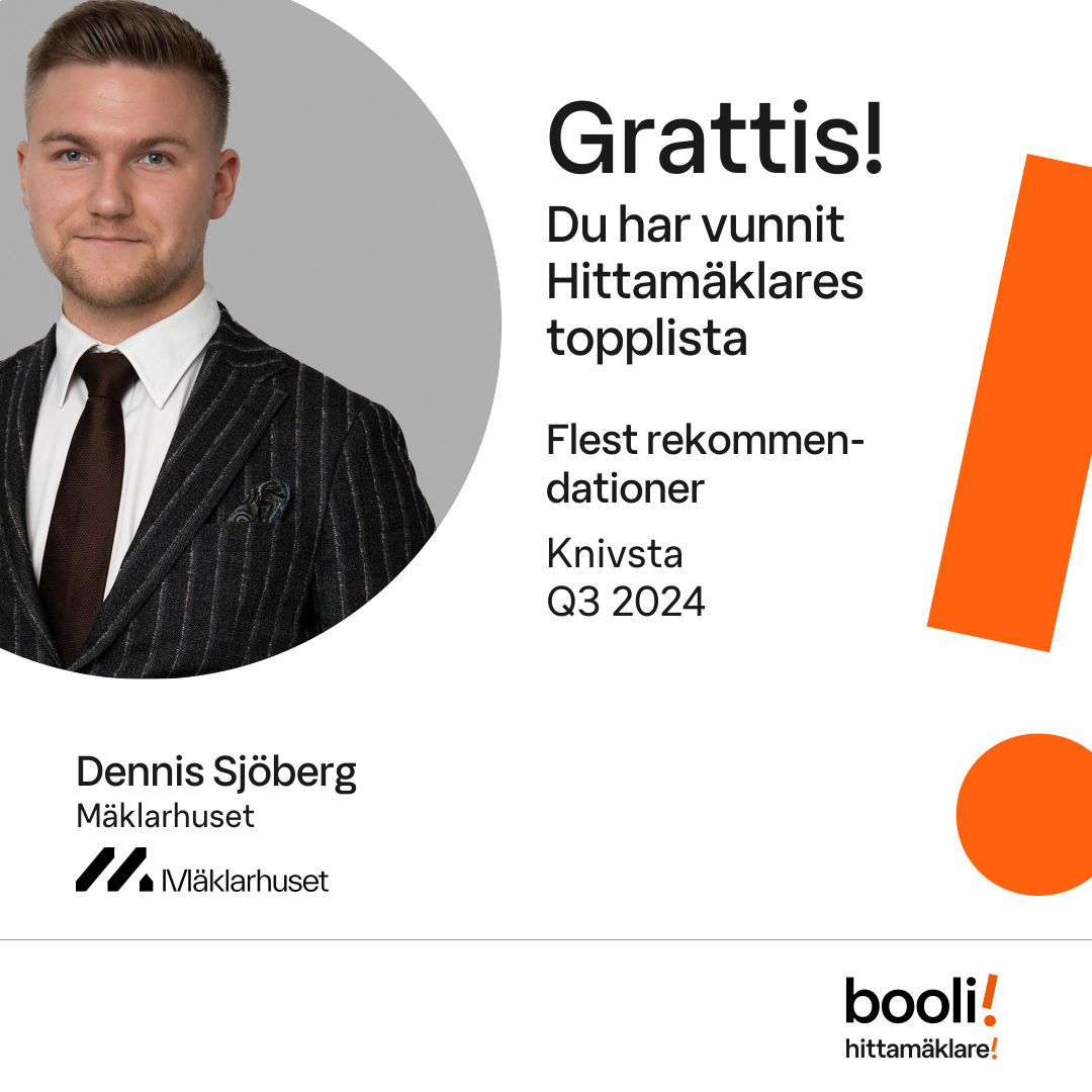 Statistik för publicerade bostäder, försäljningar och omdömen baseras på data från Booli och Hittamäklare. Statistiken för försäljningar avser inrapporterade och verifierade slutpriser från mäklare eller av Booli inhämtade och verifierade slutpriser. Statistiken för publicerade bostäder baseras på information som publicerats på Booli.se. Statistik för omdömen och rekommendationer baseras på omdömen från säljare som lämnats via Booli och Hittamäklare.