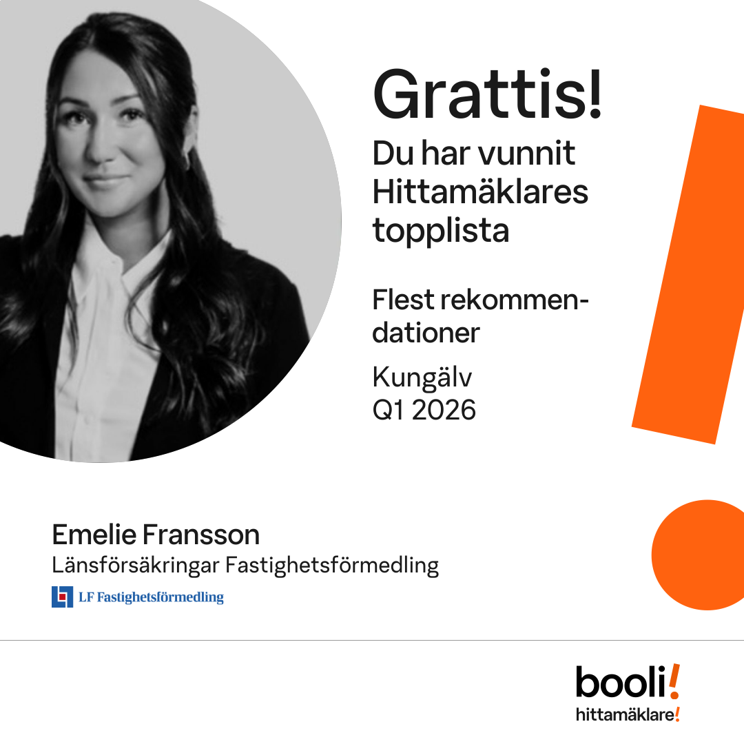 Statistik för publicerade bostäder, försäljningar och omdömen baseras på data från Booli. Statistiken för försäljningar avser inrapporterade och verifierade slutpriser från mäklare eller av Booli inhämtade och verifierade slutpriser. Statistiken för publicerade bostäder baseras på information som publicerats på Booli.se. Statistik för omdömen och rekommendationer baseras på omdömen från säljare som lämnats via Booli.