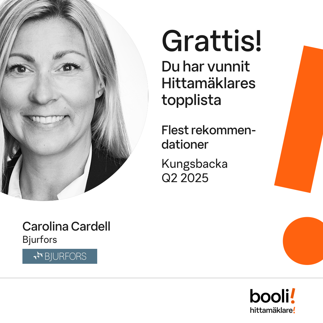 Statistik för publicerade bostäder, försäljningar och omdömen baseras på data från Booli och Hittamäklare. Statistiken för försäljningar avser inrapporterade och verifierade slutpriser från mäklare eller av Booli inhämtade och verifierade slutpriser. Statistiken för publicerade bostäder baseras på information som publicerats på Booli.se. Statistik för omdömen och rekommendationer baseras på omdömen från säljare som lämnats via Booli och Hittamäklare.