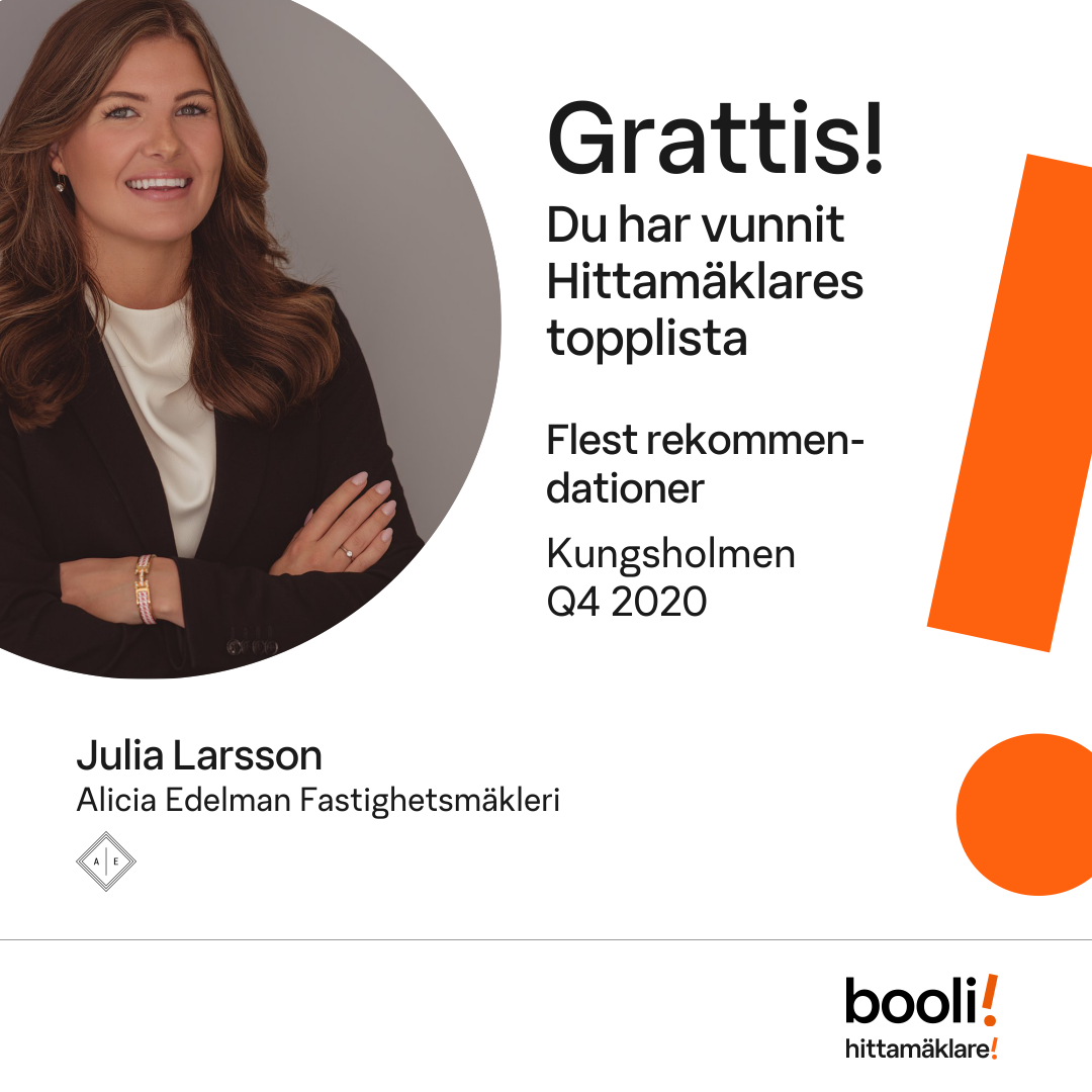 Statistik för publicerade bostäder, försäljningar och omdömen baseras på data från Booli och Hittamäklare. Statistiken för försäljningar avser inrapporterade och verifierade slutpriser från mäklare eller av Booli inhämtade och verifierade slutpriser. Statistiken för publicerade bostäder baseras på information som publicerats på Booli.se. Statistik för omdömen och rekommendationer baseras på omdömen från säljare som lämnats via Booli och Hittamäklare.