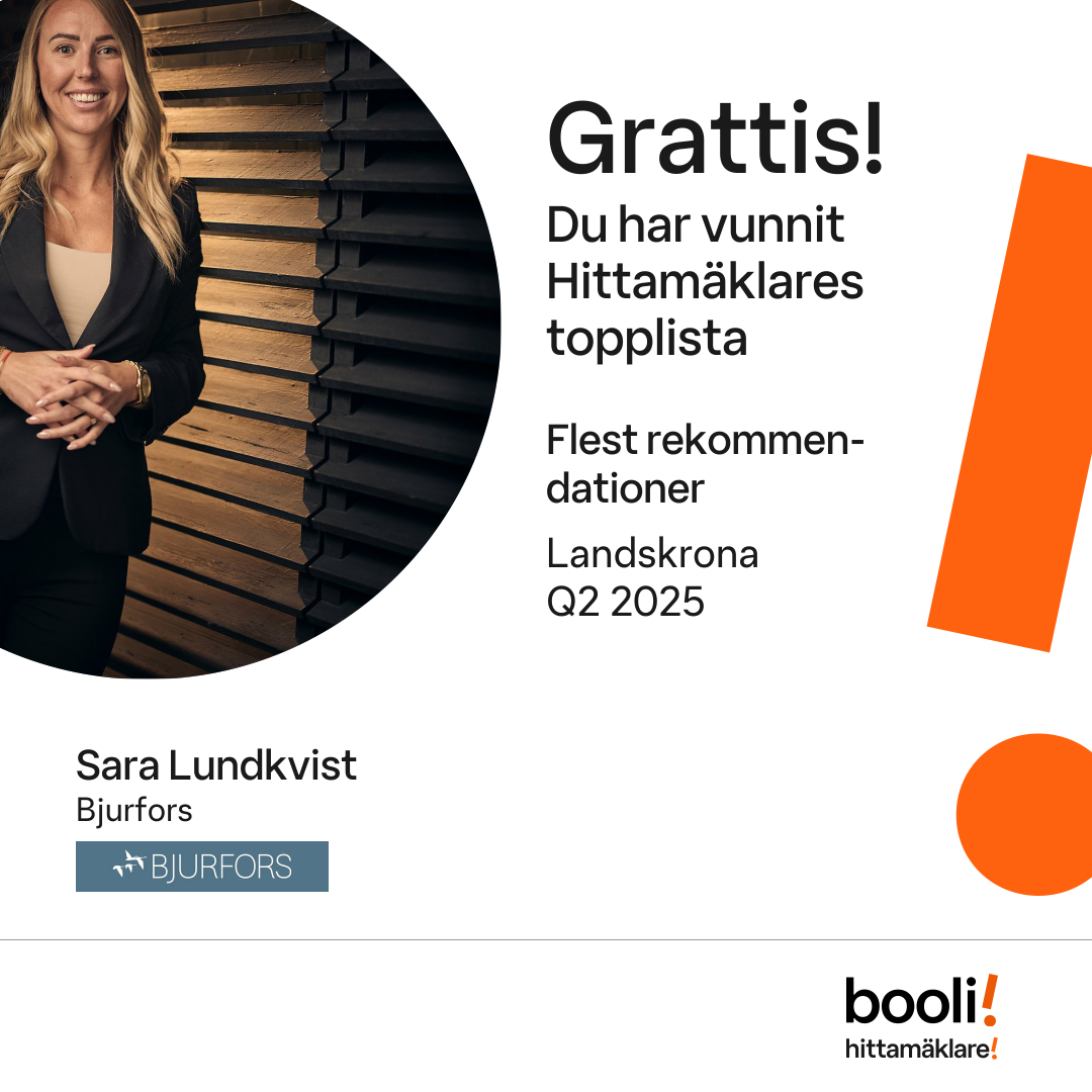 Statistik för publicerade bostäder, försäljningar och omdömen baseras på data från Booli och Hittamäklare. Statistiken för försäljningar avser inrapporterade och verifierade slutpriser från mäklare eller av Booli inhämtade och verifierade slutpriser. Statistiken för publicerade bostäder baseras på information som publicerats på Booli.se. Statistik för omdömen och rekommendationer baseras på omdömen från säljare som lämnats via Booli och Hittamäklare.