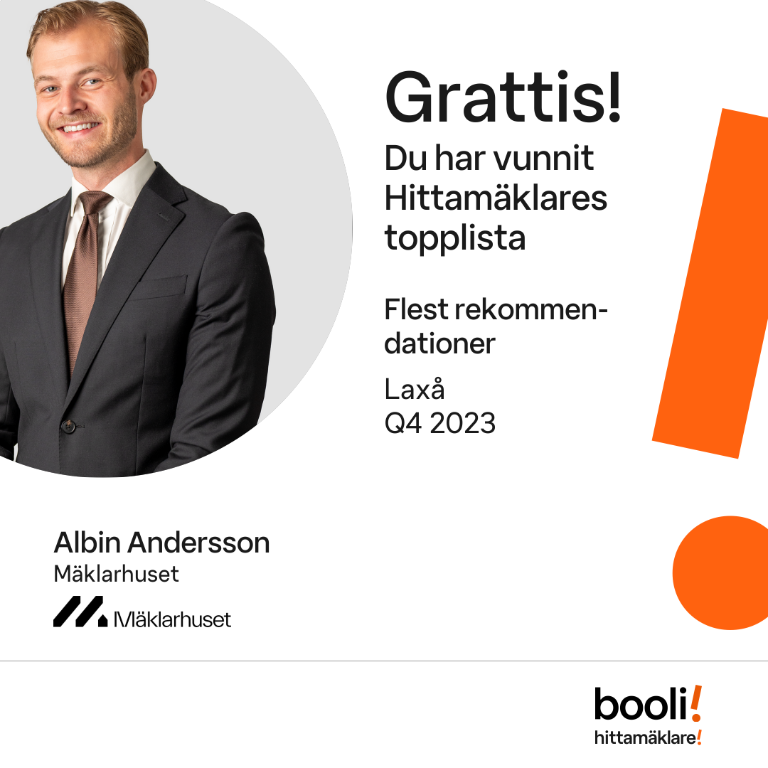 Statistik för publicerade bostäder, försäljningar och omdömen baseras på data från Booli och Hittamäklare. Statistiken för försäljningar avser inrapporterade och verifierade slutpriser från mäklare eller av Booli inhämtade och verifierade slutpriser. Statistiken för publicerade bostäder baseras på information som publicerats på Booli.se. Statistik för omdömen och rekommendationer baseras på omdömen från säljare som lämnats via Booli och Hittamäklare.