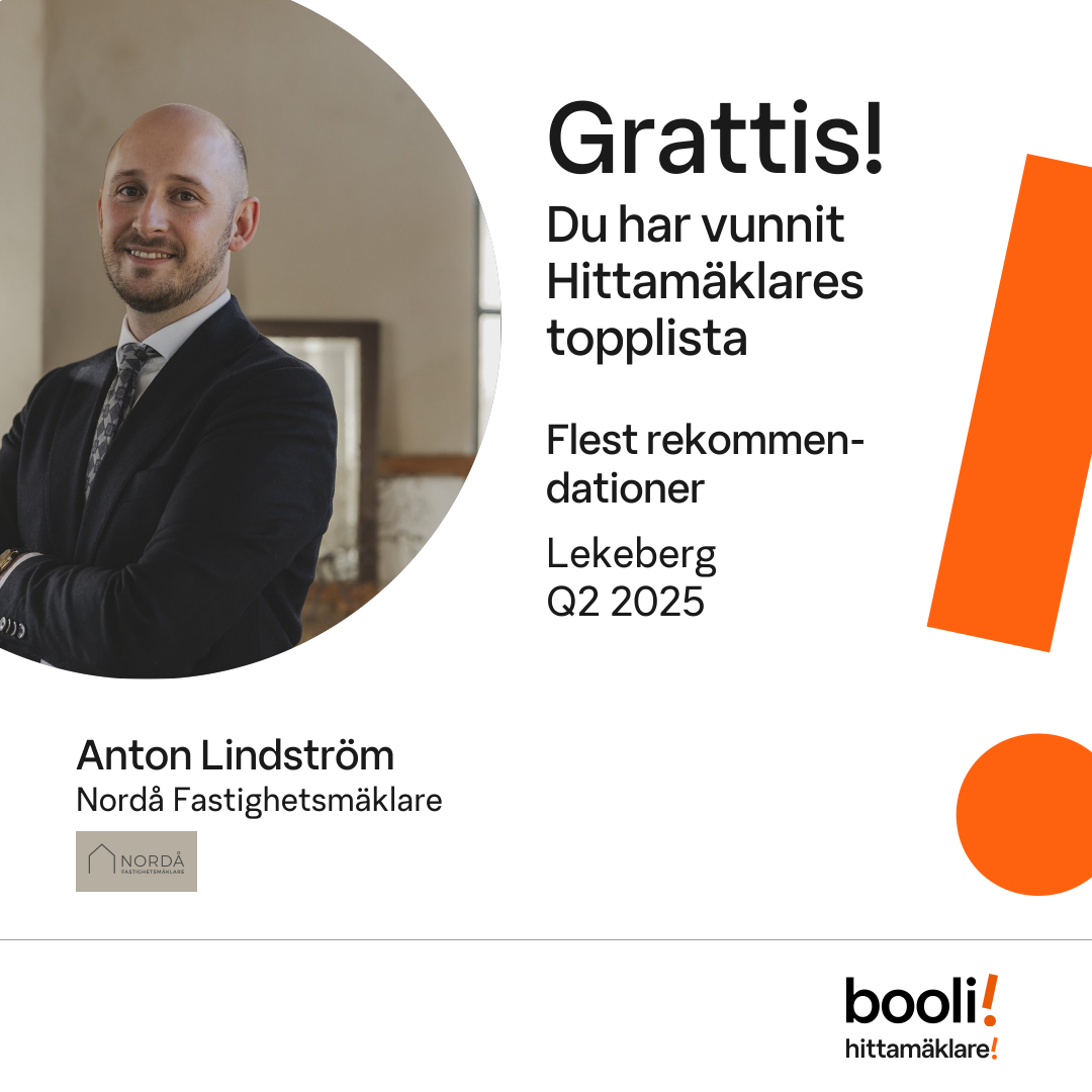 Statistik för publicerade bostäder, försäljningar och omdömen baseras på data från Booli och Hittamäklare. Statistiken för försäljningar avser inrapporterade och verifierade slutpriser från mäklare eller av Booli inhämtade och verifierade slutpriser. Statistiken för publicerade bostäder baseras på information som publicerats på Booli.se. Statistik för omdömen och rekommendationer baseras på omdömen från säljare som lämnats via Booli och Hittamäklare.