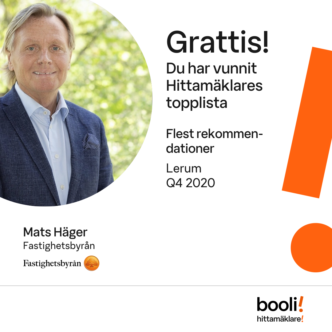 Statistik för publicerade bostäder, försäljningar och omdömen baseras på data från Booli och Hittamäklare. Statistiken för försäljningar avser inrapporterade och verifierade slutpriser från mäklare eller av Booli inhämtade och verifierade slutpriser. Statistiken för publicerade bostäder baseras på information som publicerats på Booli.se. Statistik för omdömen och rekommendationer baseras på omdömen från säljare som lämnats via Booli och Hittamäklare.