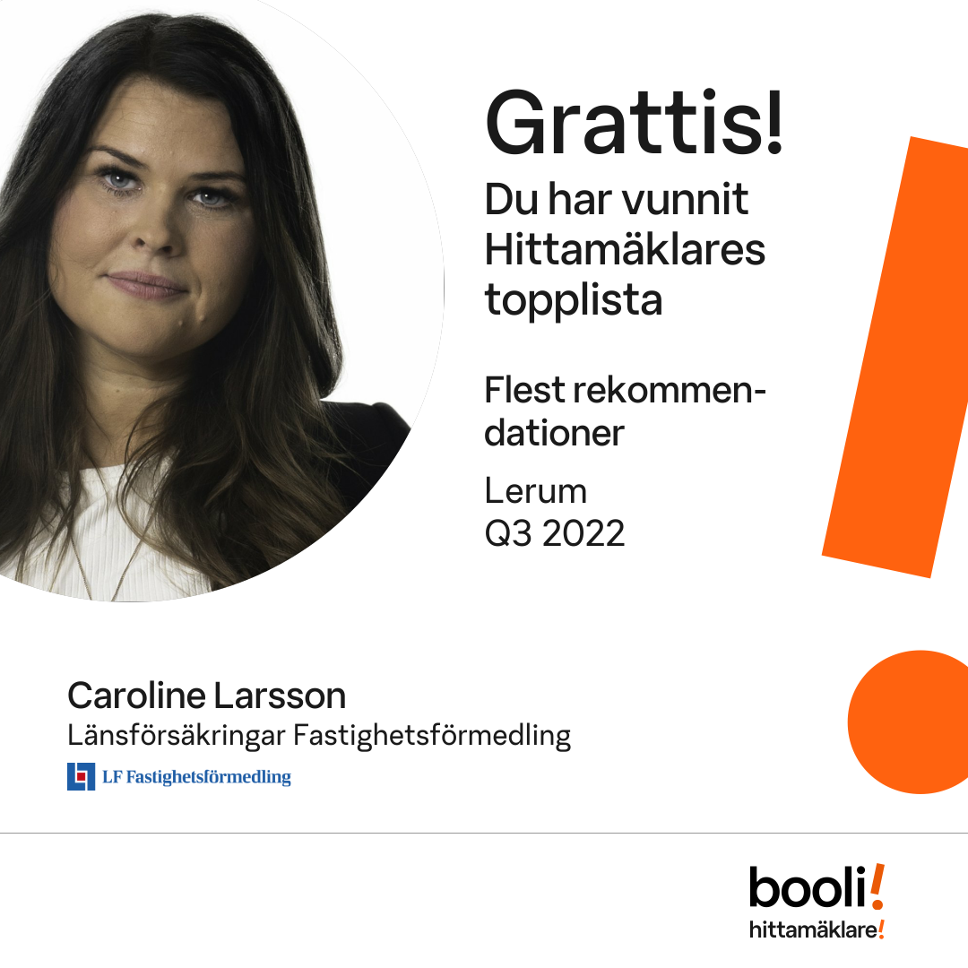 Statistik för publicerade bostäder, försäljningar och omdömen baseras på data från Booli och Hittamäklare. Statistiken för försäljningar avser inrapporterade och verifierade slutpriser från mäklare eller av Booli inhämtade och verifierade slutpriser. Statistiken för publicerade bostäder baseras på information som publicerats på Booli.se. Statistik för omdömen och rekommendationer baseras på omdömen från säljare som lämnats via Booli och Hittamäklare.