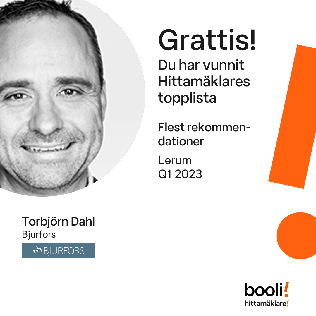 Statistik för publicerade bostäder, försäljningar och omdömen baseras på data från Booli och Hittamäklare. Statistiken för försäljningar avser inrapporterade och verifierade slutpriser från mäklare eller av Booli inhämtade och verifierade slutpriser. Statistiken för publicerade bostäder baseras på information som publicerats på Booli.se. Statistik för omdömen och rekommendationer baseras på omdömen från säljare som lämnats via Booli och Hittamäklare.
