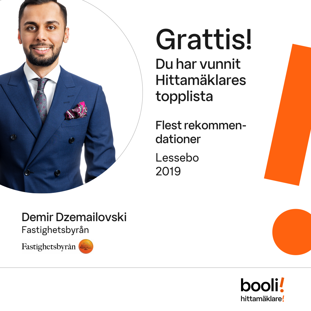 Statistik för publicerade bostäder, försäljningar och omdömen baseras på data från Booli och Hittamäklare. Statistiken för försäljningar avser inrapporterade och verifierade slutpriser från mäklare eller av Booli inhämtade och verifierade slutpriser. Statistiken för publicerade bostäder baseras på information som publicerats på Booli.se. Statistik för omdömen och rekommendationer baseras på omdömen från säljare som lämnats via Booli och Hittamäklare.