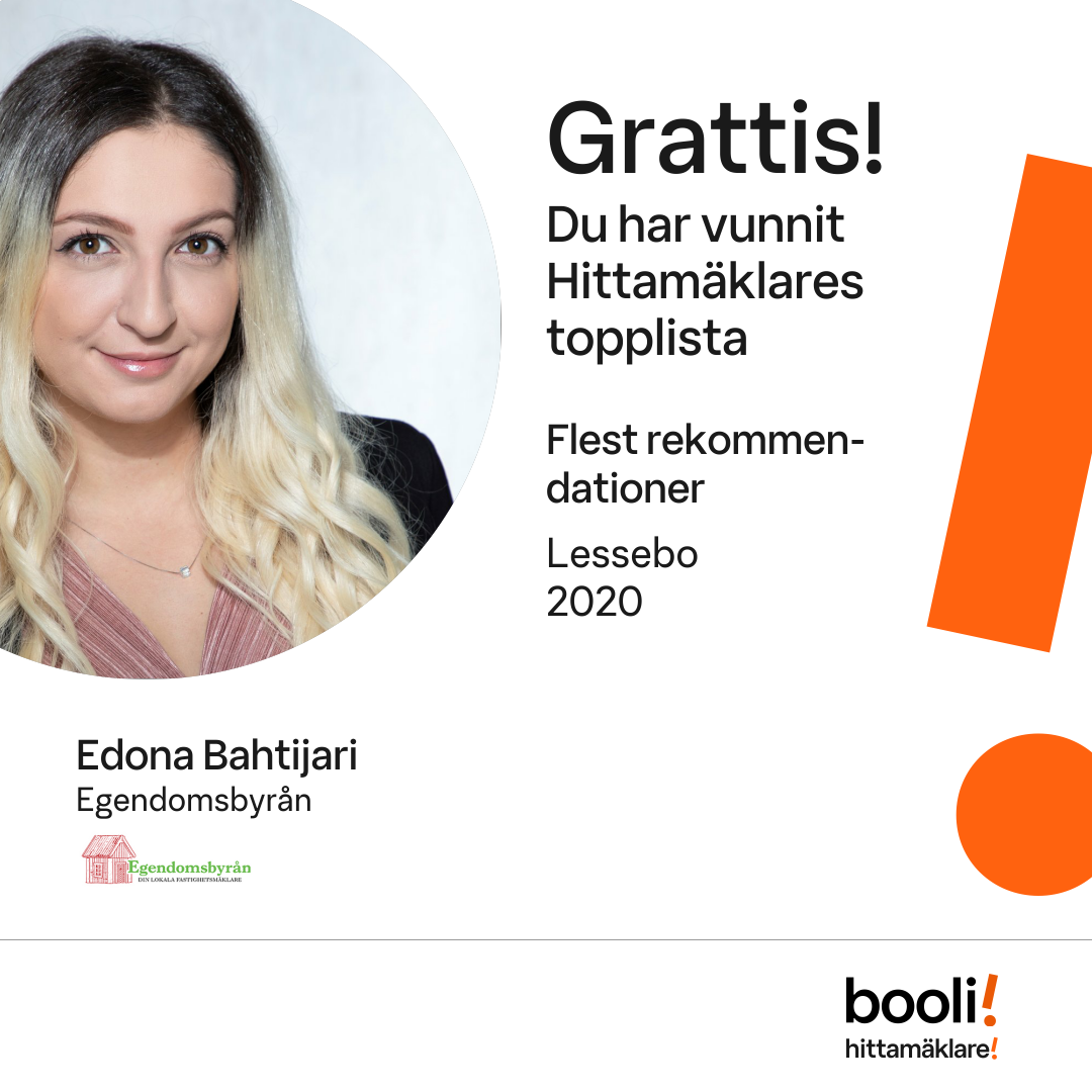 Statistik för publicerade bostäder, försäljningar och omdömen baseras på data från Booli och Hittamäklare. Statistiken för försäljningar avser inrapporterade och verifierade slutpriser från mäklare eller av Booli inhämtade och verifierade slutpriser. Statistiken för publicerade bostäder baseras på information som publicerats på Booli.se. Statistik för omdömen och rekommendationer baseras på omdömen från säljare som lämnats via Booli och Hittamäklare.