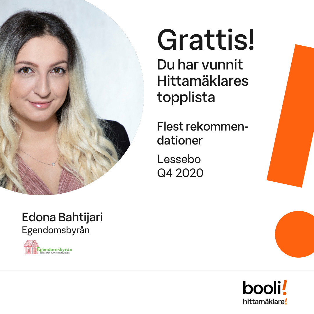 Statistik för publicerade bostäder, försäljningar och omdömen baseras på data från Booli och Hittamäklare. Statistiken för försäljningar avser inrapporterade och verifierade slutpriser från mäklare eller av Booli inhämtade och verifierade slutpriser. Statistiken för publicerade bostäder baseras på information som publicerats på Booli.se. Statistik för omdömen och rekommendationer baseras på omdömen från säljare som lämnats via Booli och Hittamäklare.