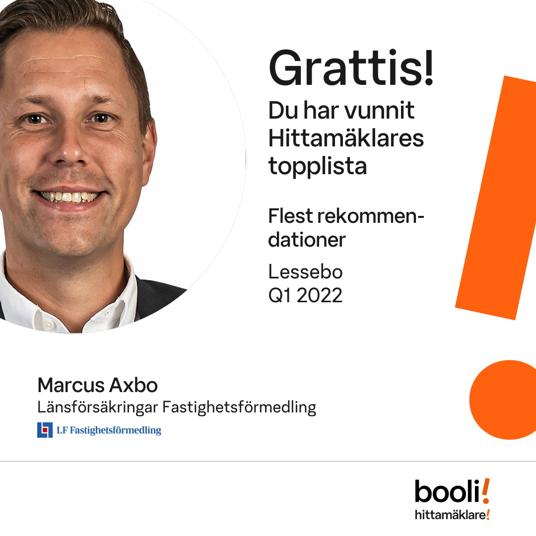 Statistik för publicerade bostäder, försäljningar och omdömen baseras på data från Booli och Hittamäklare. Statistiken för försäljningar avser inrapporterade och verifierade slutpriser från mäklare eller av Booli inhämtade och verifierade slutpriser. Statistiken för publicerade bostäder baseras på information som publicerats på Booli.se. Statistik för omdömen och rekommendationer baseras på omdömen från säljare som lämnats via Booli och Hittamäklare.