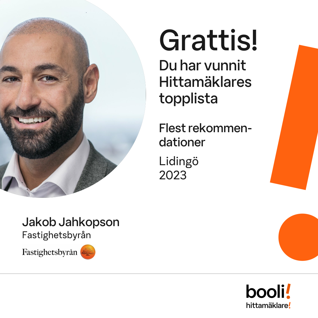 Statistik för publicerade bostäder, försäljningar och omdömen baseras på data från Booli och Hittamäklare. Statistiken för försäljningar avser inrapporterade och verifierade slutpriser från mäklare eller av Booli inhämtade och verifierade slutpriser. Statistiken för publicerade bostäder baseras på information som publicerats på Booli.se. Statistik för omdömen och rekommendationer baseras på omdömen från säljare som lämnats via Booli och Hittamäklare.