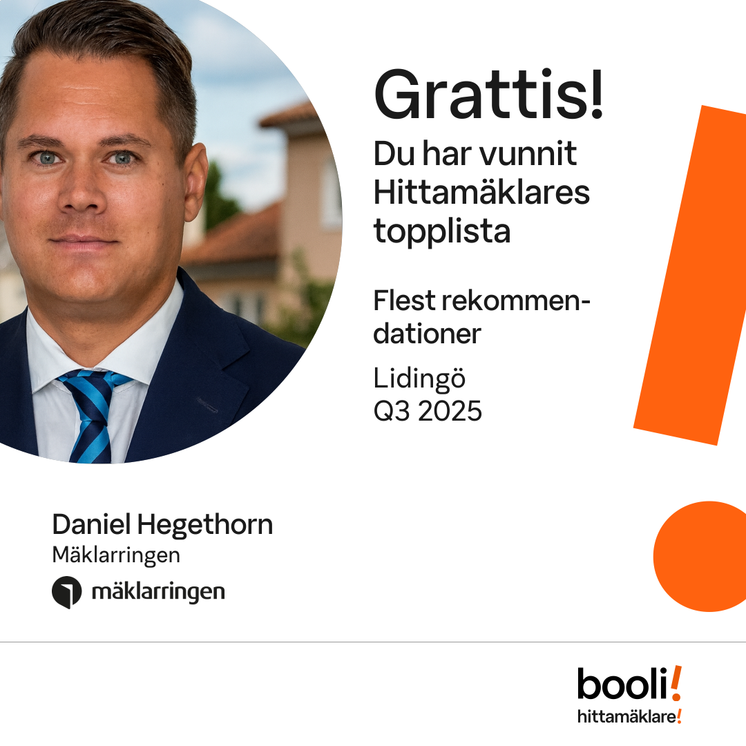 Statistik för publicerade bostäder, försäljningar och omdömen baseras på data från Booli och Hittamäklare. Statistiken för försäljningar avser inrapporterade och verifierade slutpriser från mäklare eller av Booli inhämtade och verifierade slutpriser. Statistiken för publicerade bostäder baseras på information som publicerats på Booli.se. Statistik för omdömen och rekommendationer baseras på omdömen från säljare som lämnats via Booli och Hittamäklare.