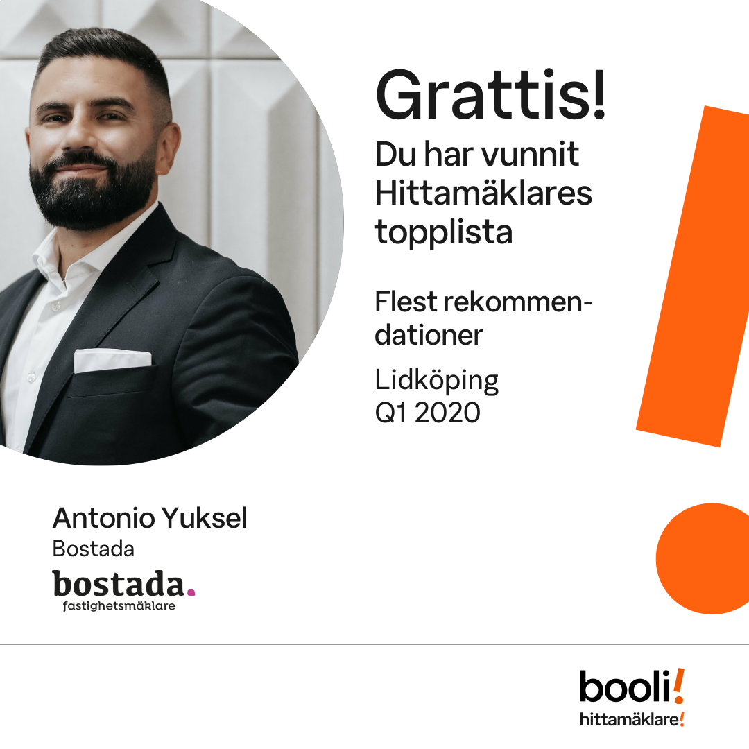 Statistik för publicerade bostäder, försäljningar och omdömen baseras på data från Booli och Hittamäklare. Statistiken för försäljningar avser inrapporterade och verifierade slutpriser från mäklare eller av Booli inhämtade och verifierade slutpriser. Statistiken för publicerade bostäder baseras på information som publicerats på Booli.se. Statistik för omdömen och rekommendationer baseras på omdömen från säljare som lämnats via Booli och Hittamäklare.