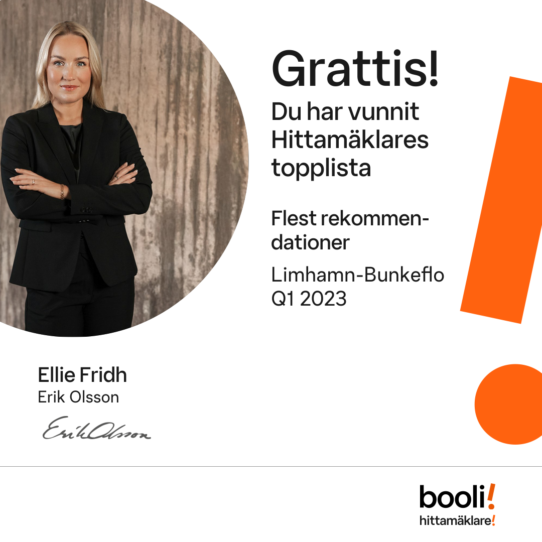 Statistik för publicerade bostäder, försäljningar och omdömen baseras på data från Booli och Hittamäklare. Statistiken för försäljningar avser inrapporterade och verifierade slutpriser från mäklare eller av Booli inhämtade och verifierade slutpriser. Statistiken för publicerade bostäder baseras på information som publicerats på Booli.se. Statistik för omdömen och rekommendationer baseras på omdömen från säljare som lämnats via Booli och Hittamäklare.