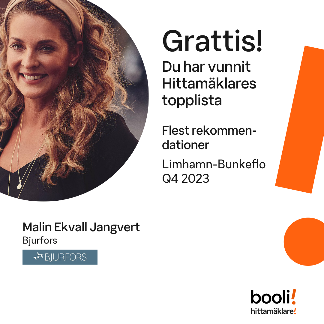 Statistik för publicerade bostäder, försäljningar och omdömen baseras på data från Booli och Hittamäklare. Statistiken för försäljningar avser inrapporterade och verifierade slutpriser från mäklare eller av Booli inhämtade och verifierade slutpriser. Statistiken för publicerade bostäder baseras på information som publicerats på Booli.se. Statistik för omdömen och rekommendationer baseras på omdömen från säljare som lämnats via Booli och Hittamäklare.