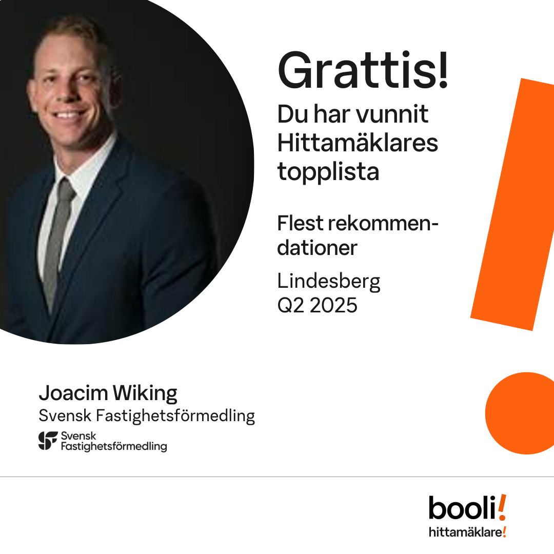 Statistik för publicerade bostäder, försäljningar och omdömen baseras på data från Booli och Hittamäklare. Statistiken för försäljningar avser inrapporterade och verifierade slutpriser från mäklare eller av Booli inhämtade och verifierade slutpriser. Statistiken för publicerade bostäder baseras på information som publicerats på Booli.se. Statistik för omdömen och rekommendationer baseras på omdömen från säljare som lämnats via Booli och Hittamäklare.