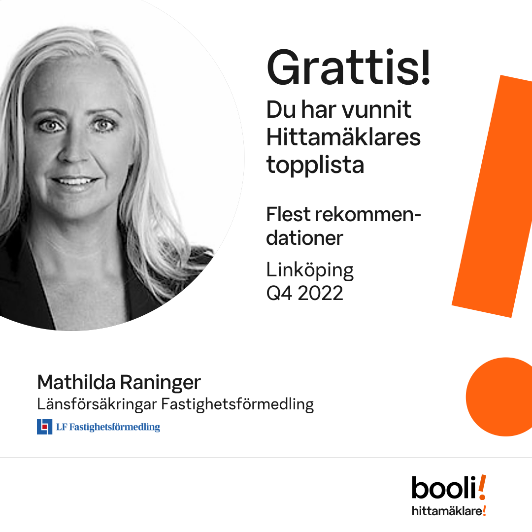 Statistik för publicerade bostäder, försäljningar och omdömen baseras på data från Booli och Hittamäklare. Statistiken för försäljningar avser inrapporterade och verifierade slutpriser från mäklare eller av Booli inhämtade och verifierade slutpriser. Statistiken för publicerade bostäder baseras på information som publicerats på Booli.se. Statistik för omdömen och rekommendationer baseras på omdömen från säljare som lämnats via Booli och Hittamäklare.