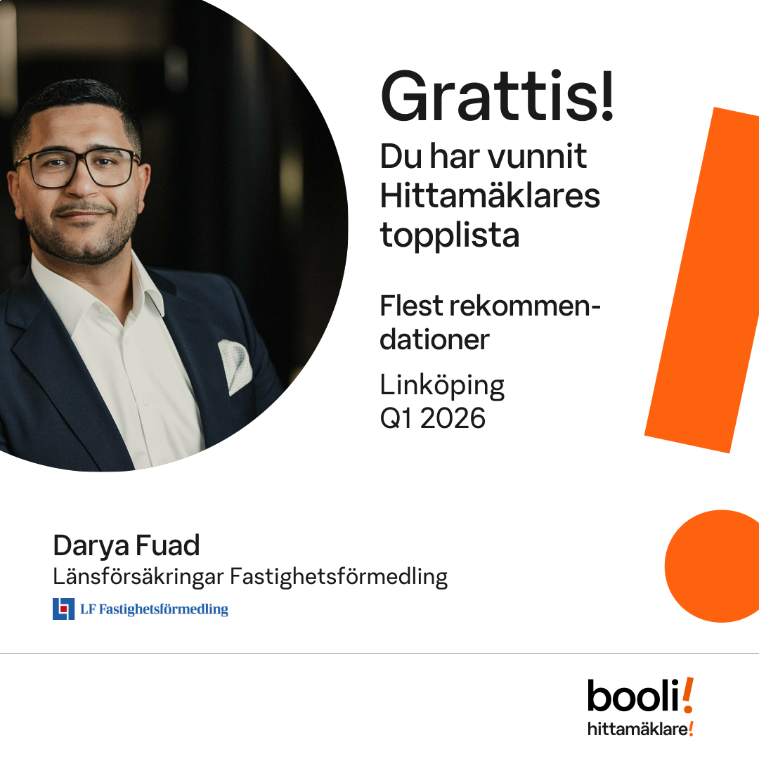 Statistik för publicerade bostäder, försäljningar och omdömen baseras på data från Booli. Statistiken för försäljningar avser inrapporterade och verifierade slutpriser från mäklare eller av Booli inhämtade och verifierade slutpriser. Statistiken för publicerade bostäder baseras på information som publicerats på Booli.se. Statistik för omdömen och rekommendationer baseras på omdömen från säljare som lämnats via Booli.