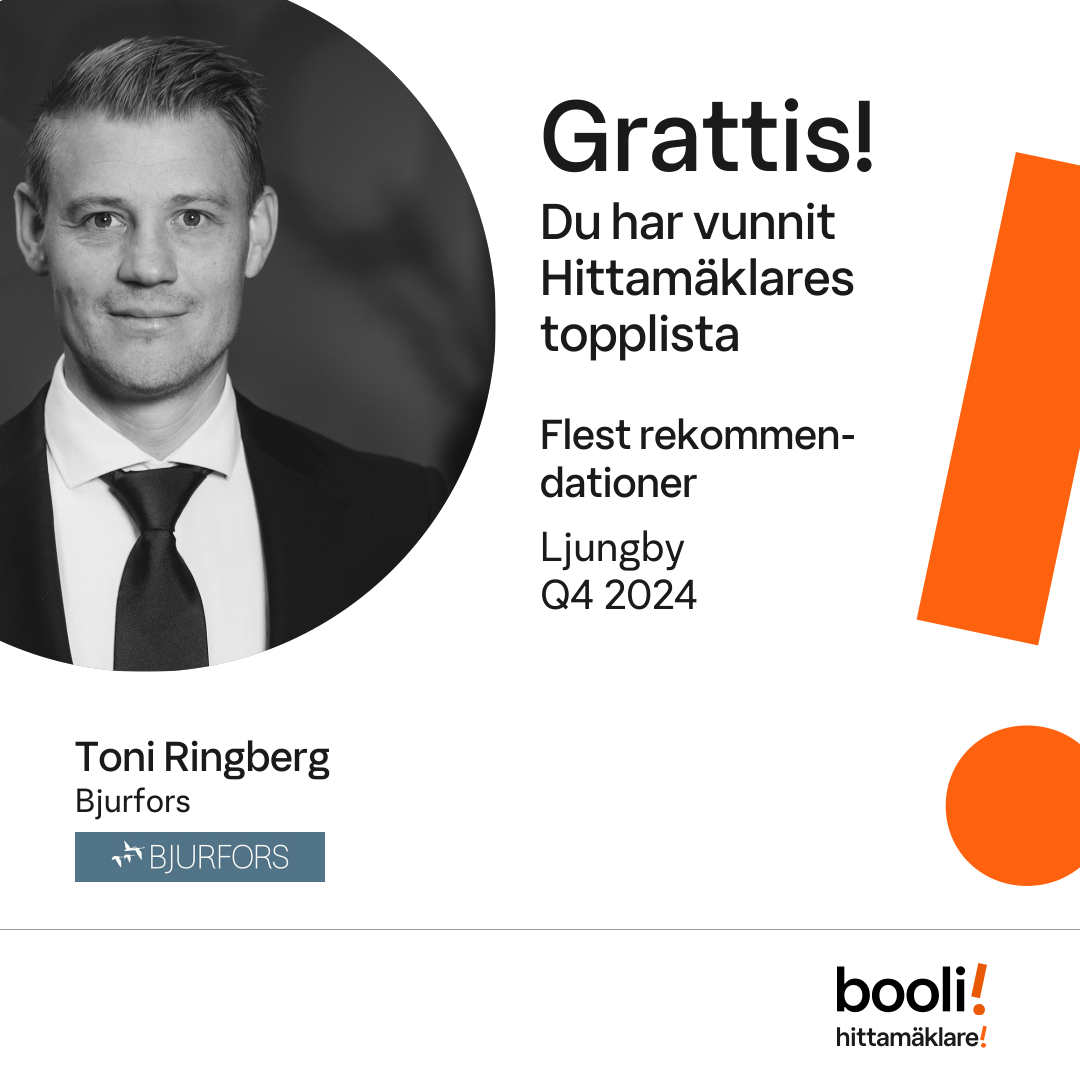 Statistik för publicerade bostäder, försäljningar och omdömen baseras på data från Booli. Statistiken för försäljningar avser inrapporterade och verifierade slutpriser från mäklare eller av Booli inhämtade och verifierade slutpriser. Statistiken för publicerade bostäder baseras på information som publicerats på Booli.se. Statistik för omdömen och rekommendationer baseras på omdömen från säljare som lämnats via Booli.