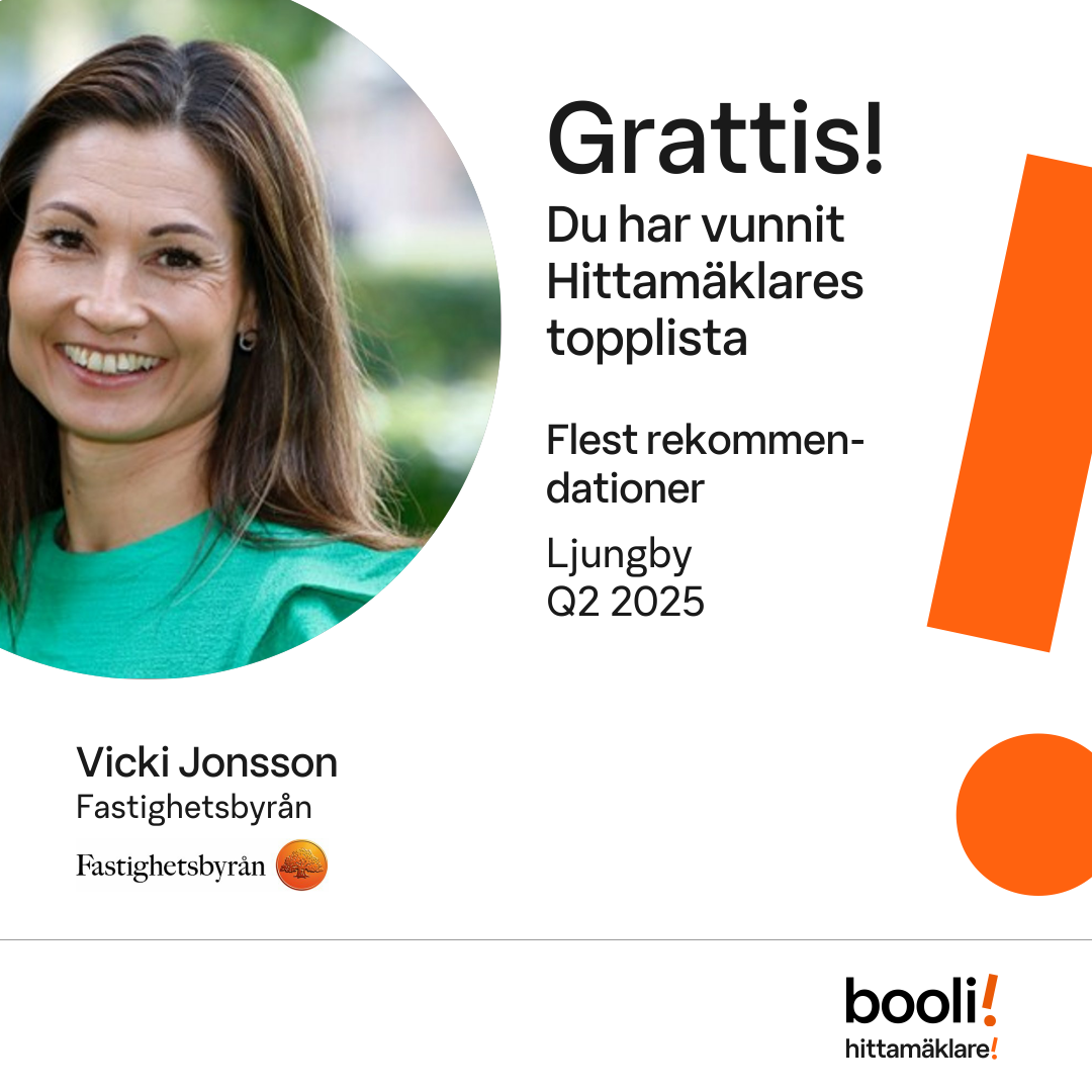 Statistik för publicerade bostäder, försäljningar och omdömen baseras på data från Booli och Hittamäklare. Statistiken för försäljningar avser inrapporterade och verifierade slutpriser från mäklare eller av Booli inhämtade och verifierade slutpriser. Statistiken för publicerade bostäder baseras på information som publicerats på Booli.se. Statistik för omdömen och rekommendationer baseras på omdömen från säljare som lämnats via Booli och Hittamäklare.