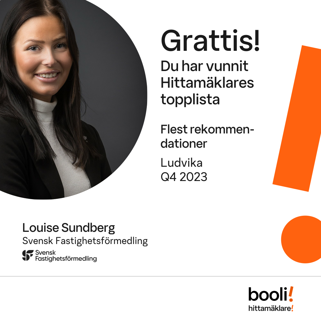 Statistik för publicerade bostäder, försäljningar och omdömen baseras på data från Booli och Hittamäklare. Statistiken för försäljningar avser inrapporterade och verifierade slutpriser från mäklare eller av Booli inhämtade och verifierade slutpriser. Statistiken för publicerade bostäder baseras på information som publicerats på Booli.se. Statistik för omdömen och rekommendationer baseras på omdömen från säljare som lämnats via Booli och Hittamäklare.