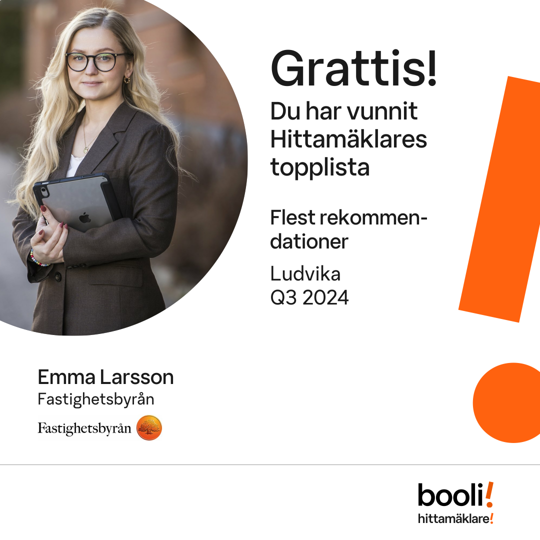 Statistik för publicerade bostäder, försäljningar och omdömen baseras på data från Booli och Hittamäklare. Statistiken för försäljningar avser inrapporterade och verifierade slutpriser från mäklare eller av Booli inhämtade och verifierade slutpriser. Statistiken för publicerade bostäder baseras på information som publicerats på Booli.se. Statistik för omdömen och rekommendationer baseras på omdömen från säljare som lämnats via Booli och Hittamäklare.